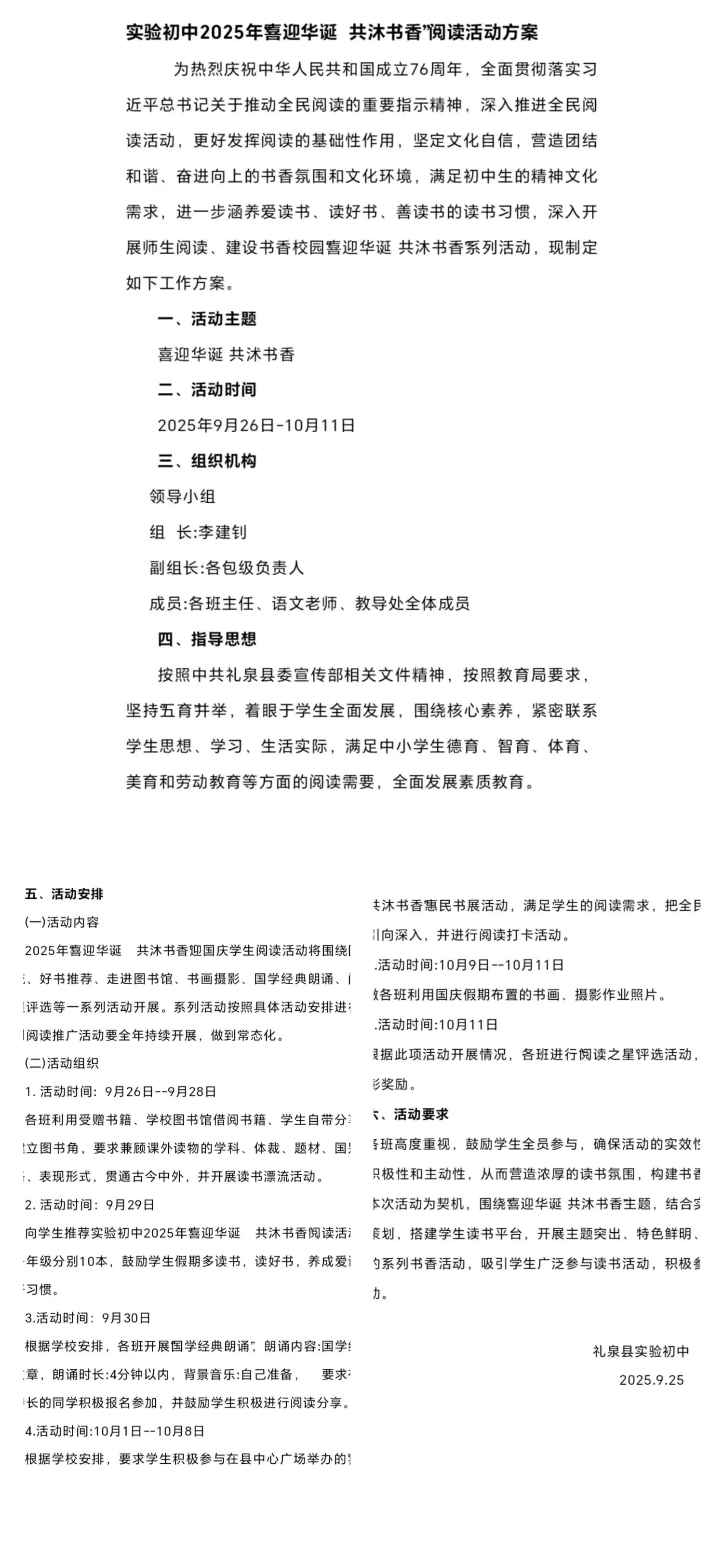 锦绣中华,盛世华诞。 在这个举国欢庆的日子, 让我们手捧一本好书, 读懂中国, 领略祖国的壮美河山 和五千年的文明历史。 文化是民族的根本,节日是民族文化传承的重要载体。为庆祝中华人民共和国成立76周年,进一步在全校营造良好的读书氛围,加强爱国主义教育,调动学生阅读书籍的积极性,实验初中开展了“喜迎华诞 共沐书香”阅读活动,全体学生积极参加,以书香作为贺礼,为祖国庆生。 第一篇 活动启幕 九月秋风轻拂,暖意融融、气氛热烈。9月26日上午,一场以“喜迎华诞 共沐书香”为主题的读书活动在实验初中温情启幕。书香与爱国情在此时此地交汇相融,绘就出一幅礼赞祖国、共沐书香的温馨画卷。 第二篇 营造氛围 学校图书室、各班级精心布置了图书展区,一本本与国家历史、国家建设成就、爱国人物故事相关的书籍,整齐地排列在书架上,仿佛在静静诉说着祖国的辉煌过往。 第三篇 师生共读 在全民阅读的活动中,校园是最蓬勃的书香沃土。我校“师生共读”,一同沉浸在书香的世界里,享受温馨的阅读时光。让阅读成为师生们的“精神加油站”,成为滋养心灵的潺潺溪流。 第四篇 经典诵读 各班围绕爱国主题,组织了经典诵读比赛。同学们坚定的声音,将经典里的家国情怀,与对祖国今日繁荣的礼赞紧紧相连。他们以声传情,赞祖国的锦绣河山,颂祖国的千年文脉,叹祖国的蓬勃发展。每一个眼神都饱含热爱,不仅让经典焕发新生,也让爱国的种子在心中扎根,更奏响了新时代少年礼赞祖国的昂扬乐章。 第五篇 假期阅读 腹有诗书气自华,阅读好时光,书香伴成长。在这举国同庆的日子里,实验初中为同学们推荐了“国庆阅读书单”,带领大家走进书籍的世界,开启这场阅读盛典。同学们也以“读”启行,以“书”导行。假期每天坚持阅读打卡,尽情遨游在书海里,与书开启了国庆之旅。 第六篇 阅读分享 各班组织了读书分享会,同学们纷纷朗诵爱国名篇,有的深情吟诵,有的温情诉说,有的慷慨激昂,有的缓缓道来......无不表达对祖国的热爱之情,展现新时代少年独有的精神风貌! 第七篇 阅读之星 10月10日,各班进行了“阅读之星”的评选。 “阅读之星”不仅是对孩子们努力的认可,更是对阅读价值的彰显。它鼓励着每一位学子,在书页翻动间,点亮知识的火花,照亮前行的道路。 本次阅读活动已圆满落幕,但书香弥漫其间,真情自然涌动。同学们在阅读中不仅汲取了智慧,更凝聚起一片炽热的爱国心,以文明实践迎接国庆,以书香墨韵共庆华诞。 当阅读遇上国庆 在书韵飘香的金秋 播下一颗知识的种子 在快乐的阅读之旅中 感悟灿烂文化 铸就实验学子奋进、爱国之心 今后,我校将继续深入推进阅读活动,不断创新活动形式,丰富活动内容,让书香弥漫校园的每一个角落,让阅读成为全体师生的良好习惯和追求! |