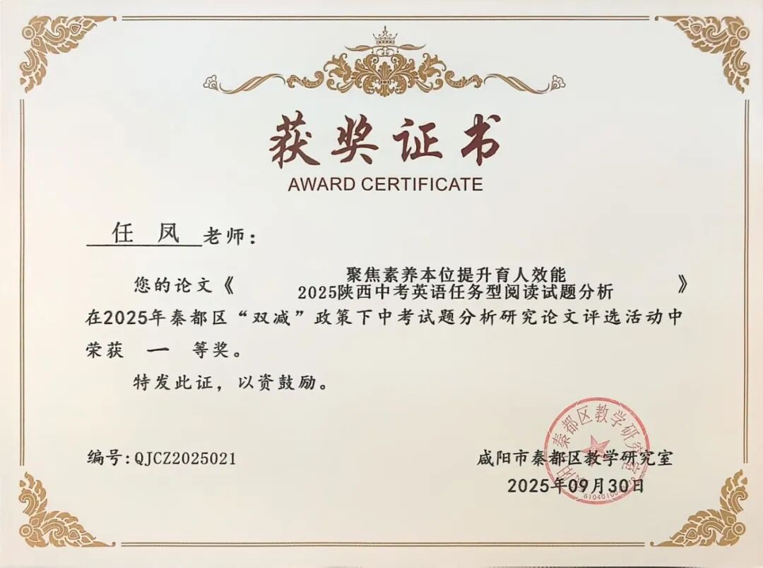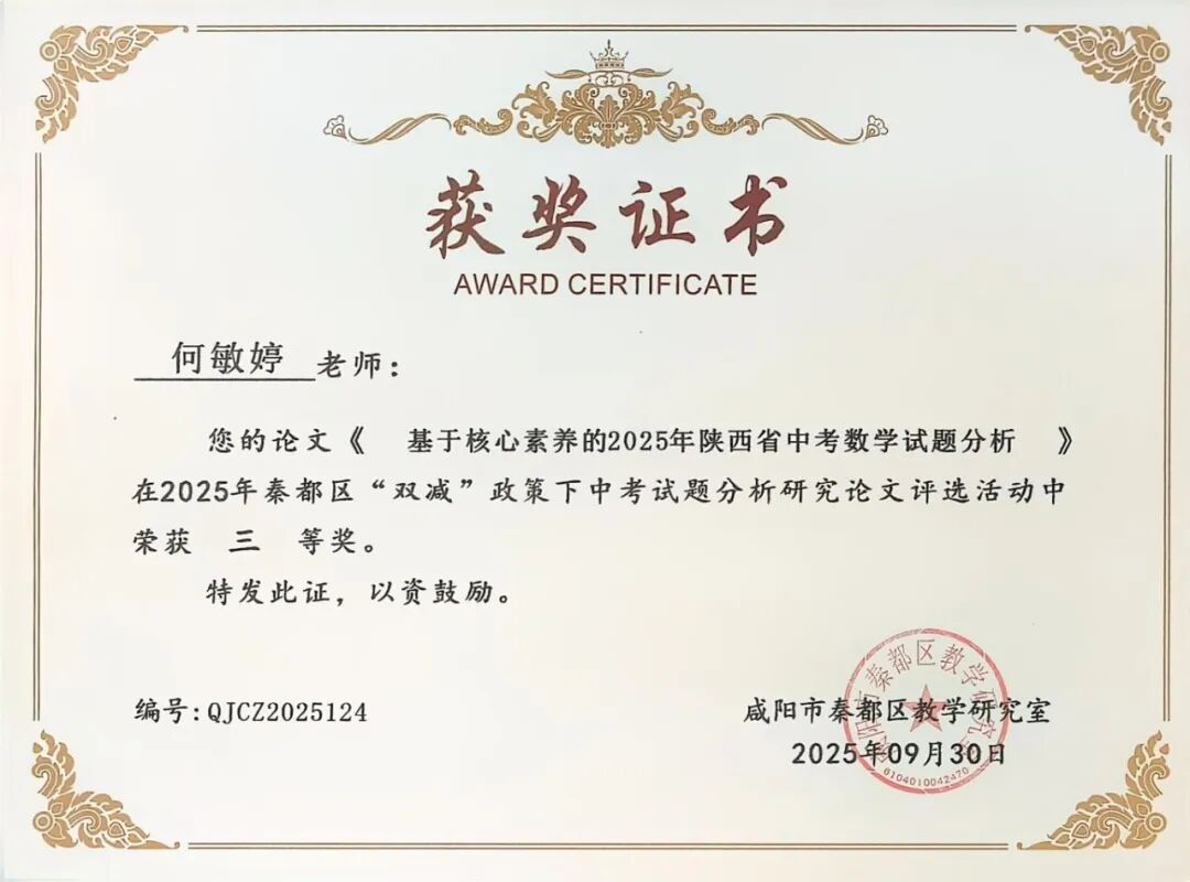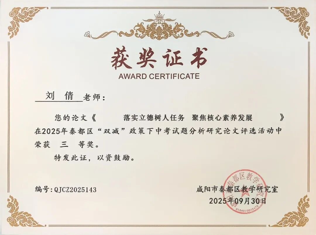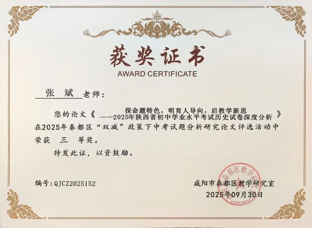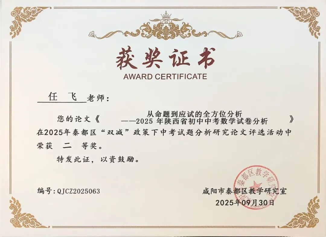 | 咸阳市秦都区天王学校17名教师在2025年秦都区“双减”政策下中考试题分析研究论文评选中斩获一二三等奖 近日,2025年秦都区“双减”政策下中考试题分析研究论文评选活动结果正式揭晓。在此次评选中,我校17名教师凭借深厚的教研功底、对“双减”政策的精准把握以及对中考试题的深入剖析,撰写的论文脱颖而出,分别荣获一、二、三等奖,充分展现了天王学校教师在教育教学研究领域的卓越实力与不懈追求! 深耕教研 引领方向 在本次评选中,姚敏、何丽霞、李萌、华妮、任凤老师的论文凭借独特的研究视角、扎实的分析过程和极具实践指导意义的结论,成功斩获一等奖。他们的论文紧密围绕“双减”政策要求,深入挖掘中考试题背后的教育理念与考查方向,不仅为一线教师精准把握中考命题趋势、优化教学策略提供了宝贵参考,更为推动“双减”背景下我校初中教育教学质量的提升注入了强劲动力。 潜心钻研 成果显著 任飞、李娅会、昝玺、吴芳、巩楠、李华老师的论文同样表现亮眼,荣获二等奖。这些论文聚焦“双减”政策下中考试题的变化特点,结合教学实际案例,对试题的考查重点、难易程度以及对学生核心素养的培养导向进行了细致分析,为教师调整教学方法、减轻学生过重课业负担、提升课堂教学效率提供了切实可行的思路,彰显了我校教师潜心钻研、求真务实的教研态度。 聚焦素养 助力教学 段文瑛、张斌、刘倩、成淑绸、李瑜、何敏婷老师的论文荣获三等奖。这些论文同样兼具理论深度与实践价值,为我校初中各学科教学与中考备考工作提供了有力支持。 此次论文评选活动,不仅是对天王学校教师教研成果的一次集中展示与肯定,更是我校推动“双减”政策落地见效、深化教育教学改革的重要举措。希望获奖教师珍惜荣誉、再接再厉,充分发挥示范引领作用,带动更多教师投身教育教学研究;也期待广大教师以获奖教师为榜样,立足教学实际,积极探索“双减”政策下教育教学的新方法、新思路,为秦都区教育事业的高质量发展贡献更多智慧与力量! |